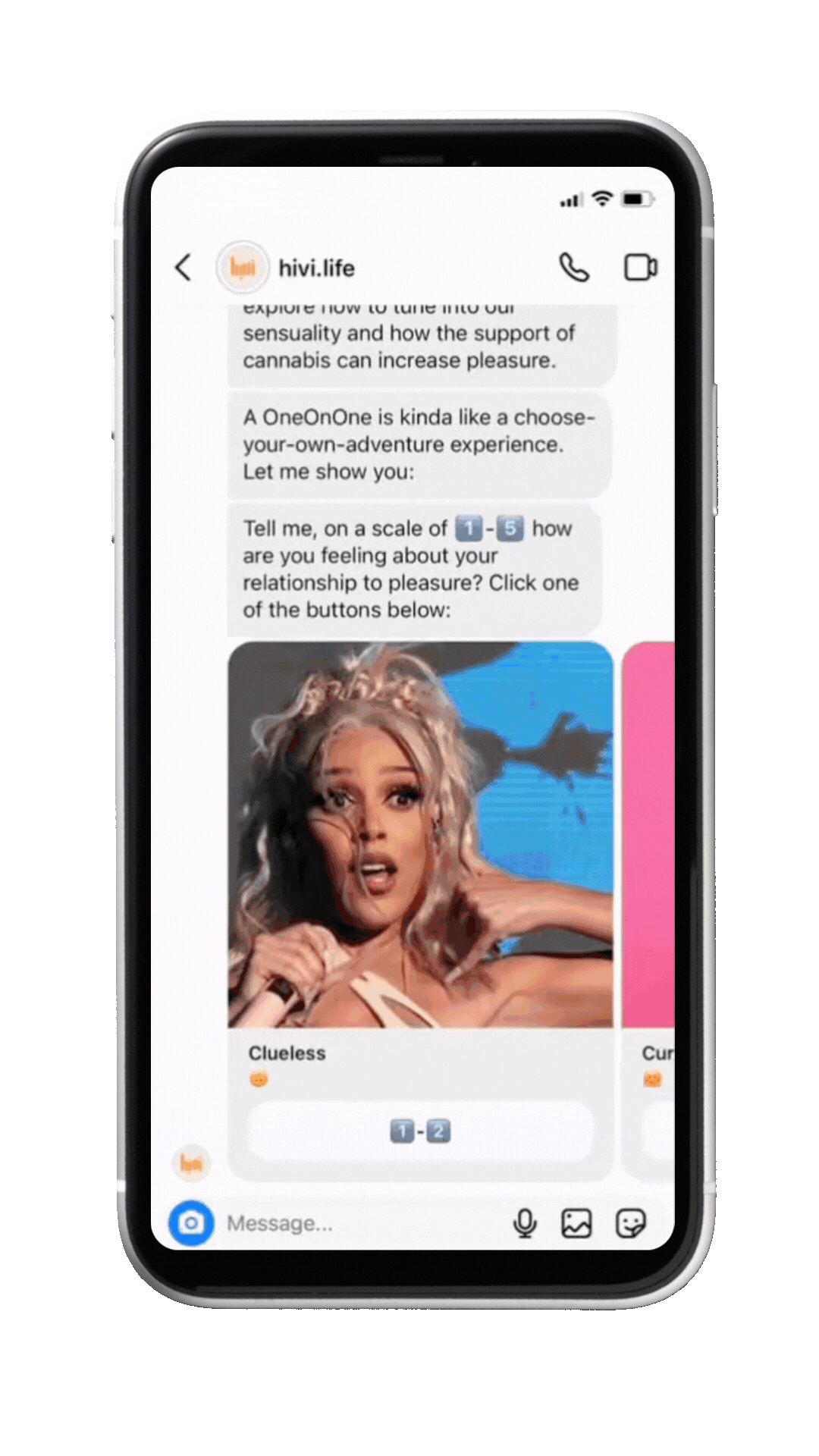 To support that mission, Huxly designed an interactive edutainment OneOnOne™ in Instagram DMs that helped people explore cannabis as a tool for wellness and pleasure, while seamlessly delivering the right products to the right people at the right time.